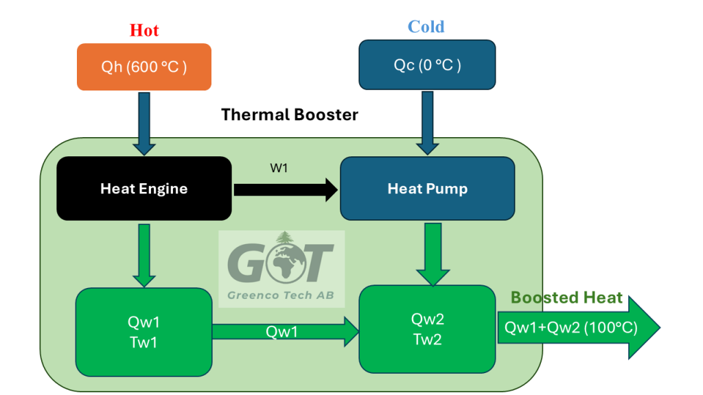 Greenco Tech’s Thermal Booster is a unique heat-driven heat pump that transforms low-grade heat into higher-value thermal energy. By coupling a heat engine with a heat pump in a smart and efficient thermodynamic cycle, the Thermal Booster delivers significantly more usable heat than the input, all without electricity.